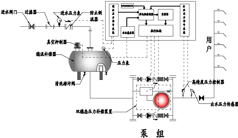 另外如設(shè)備原理圖所示,通過微機(jī)控制、雙穩(wěn)態(tài)壓力補(bǔ)償裝置及真空補(bǔ)償系統(tǒng),使本設(shè)備可以和自來水直接串接,因水泵工作的疊加原理,使設(shè)備可以充分利用自來水原有的壓力,增加了變頻調(diào)速給水設(shè)備的節(jié)能點。當(dāng)自來水壓力不足致使壓力下降時,本設(shè)備通過真空抑制器及穩(wěn)流補(bǔ)償器中的檢測裝置采集穩(wěn)流補(bǔ)償器內(nèi)的水位信號,通過微機(jī)控制真空抑制器及雙穩(wěn)態(tài)壓力補(bǔ)償裝置中的的特殊裝置動作,抑制負(fù)壓的產(chǎn)生,保證設(shè)備不對城市管網(wǎng)產(chǎn)生任何影響。