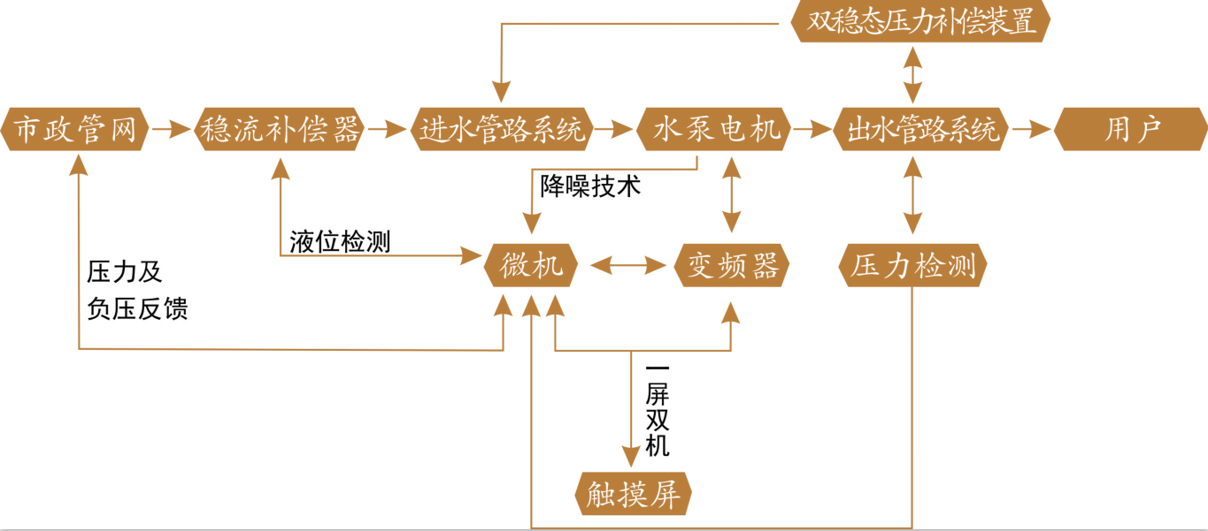 無負(fù)壓供水設(shè)備采用微機(jī)變頻技術(shù)、降噪技術(shù)、一屏雙機(jī)技術(shù)、雙穩(wěn)態(tài)壓力補(bǔ)償技術(shù)、負(fù)壓處理技術(shù)實現(xiàn)無負(fù)壓供水。通過觸摸屏顯示運行狀態(tài),通過微機(jī)控制、雙穩(wěn)態(tài)壓補(bǔ)償裝置及真空補(bǔ)償系統(tǒng),實現(xiàn)了與自來水管網(wǎng)直接串接,并且克服了對管網(wǎng)的不良影響。